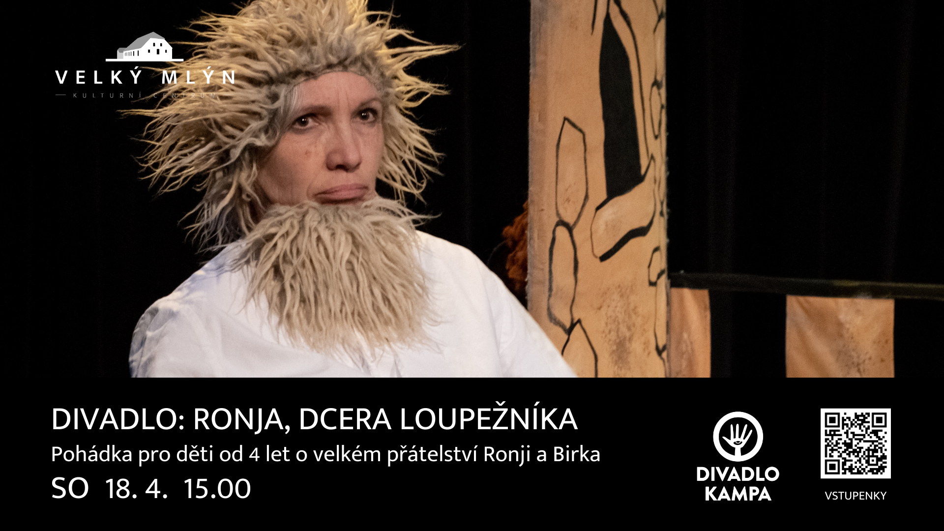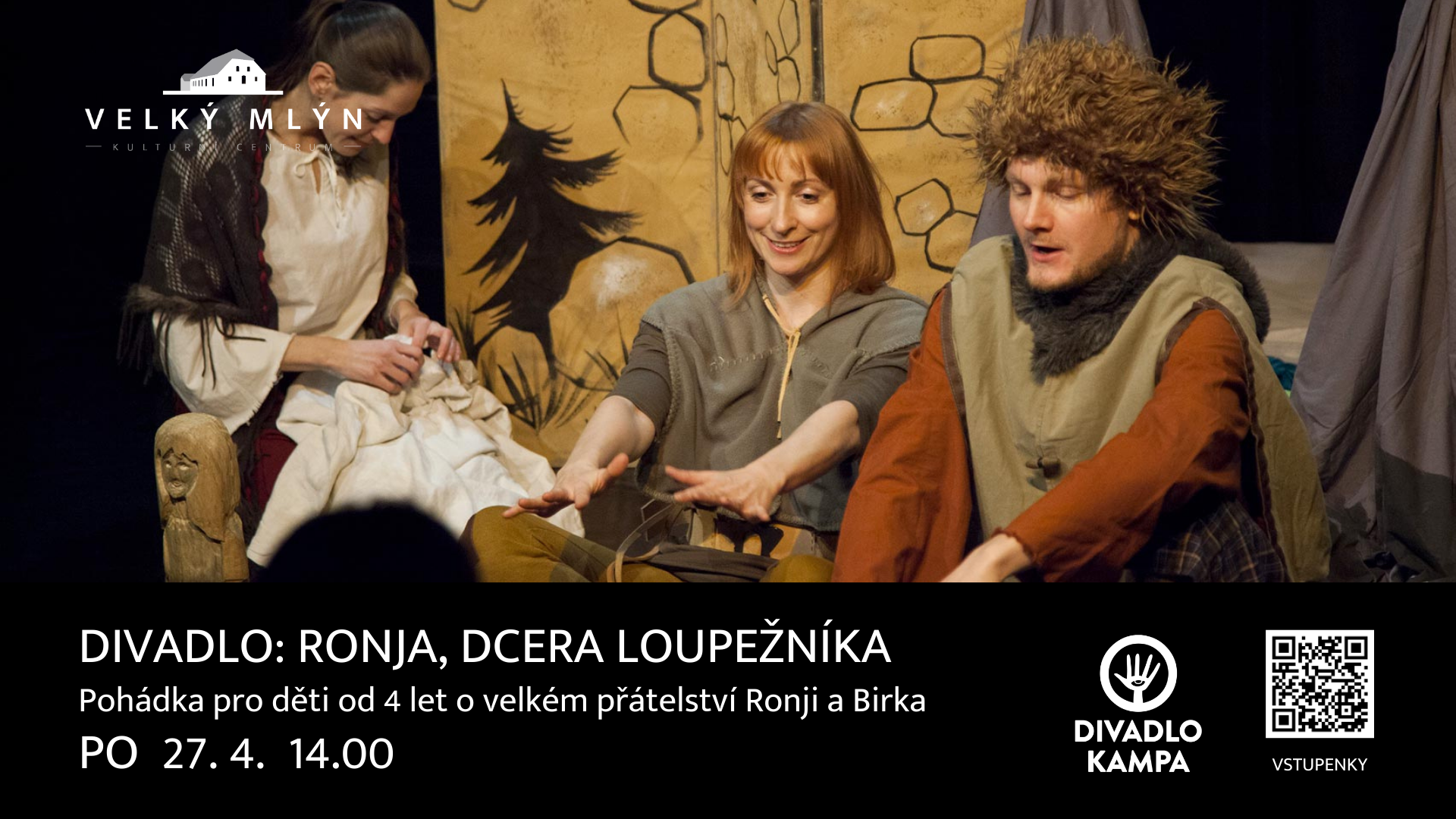 VSTUPENKY Dramatizace známé pohádky. Vypráví příběh o velikém přátelství Ronji a Birka. „Romeo a Julie pro děti“, tak by také mohl znít podtitul. Vhodné pro děti od 4 let. V představení nechybí dojemné i rozverné písničky, doprovázené živě hrou na kytaru. Hrají: Matěj Štrunc / Marek Menšík, Iveta Dušková / Pavla Drtinová, Josef Horák, Klára Jakubová / Agáta …